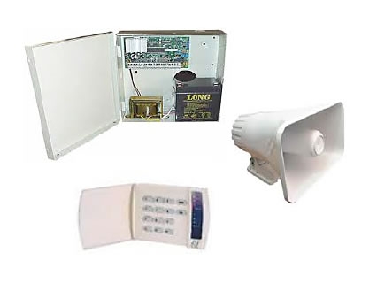 Central de Alarma DSC con tarjeta de control, transformador, batería, caja metálica, sirena, teclado para 4 zonas, puede ser monitoreada con programación a 4 números telefónicos.