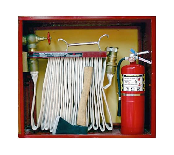 Accesorios y Gabinete 80*80*20 rojo con caja metálica (*): válvula angular de 1 1/2″ de bronce, niple de bronce, rack metálico ( Colgador de manguera) rojo, pitón de bronce, extintor 10Lbs PQS Cat: ABC, Llave spaner , manguera de 15, hacha mango largo.