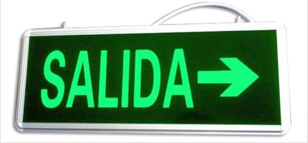 Letrero de emergencia con leds de 120-2V, Luz verde o roja en acrílico transparente, encendido continuo y soporte de batería 60 minutos aprox.